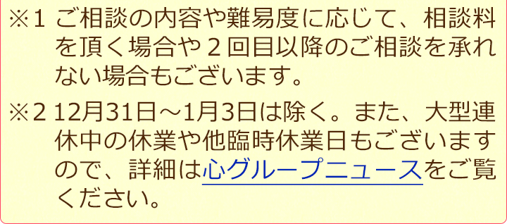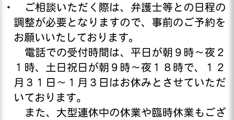 ご都合が合いにくい場合には、まずはお電話でご相談いただくことも可能です。