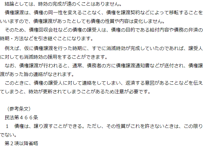 トップお役立ち情報・Q&AQ&A債権譲渡と時効に関するQ&A 階層構造▼ お役立ち情報・Q&A(目次) 債権譲渡と時効に関するQ&AQ債権譲渡が行われていた場合、時効の完成は遠のくのでしょうか?Qどこに債権譲渡が行われたか分からないのですが、時効の援用を相談できますか?Q債権回収会社から連絡がきたのですが、どうしたらよいでしょうか? Q債権譲渡が行われていた場合、時効の完成は遠のくのでしょうか?A Qどこに債権譲渡が行われたか分からないのですが、時効の援用を相談できますか?AQ債権回収会社から連絡がきたのですが、どうしたらよいでしょうか?A お役立ち情報・Q&A(目次)お役立ち情報・Q&Aトップお役立ち情報どのようなことをすると時効の利益の放棄になるかQ&A債権譲渡と時効に関するQ&A 受付時間 平日 9時~21時、土日祝 9時~18時 夜間・土日祝の相談も対応します (要予約) 所在地 〒111-1111 ●町●●建物● 0120-41-2403 お問合せ・アクセス・地図