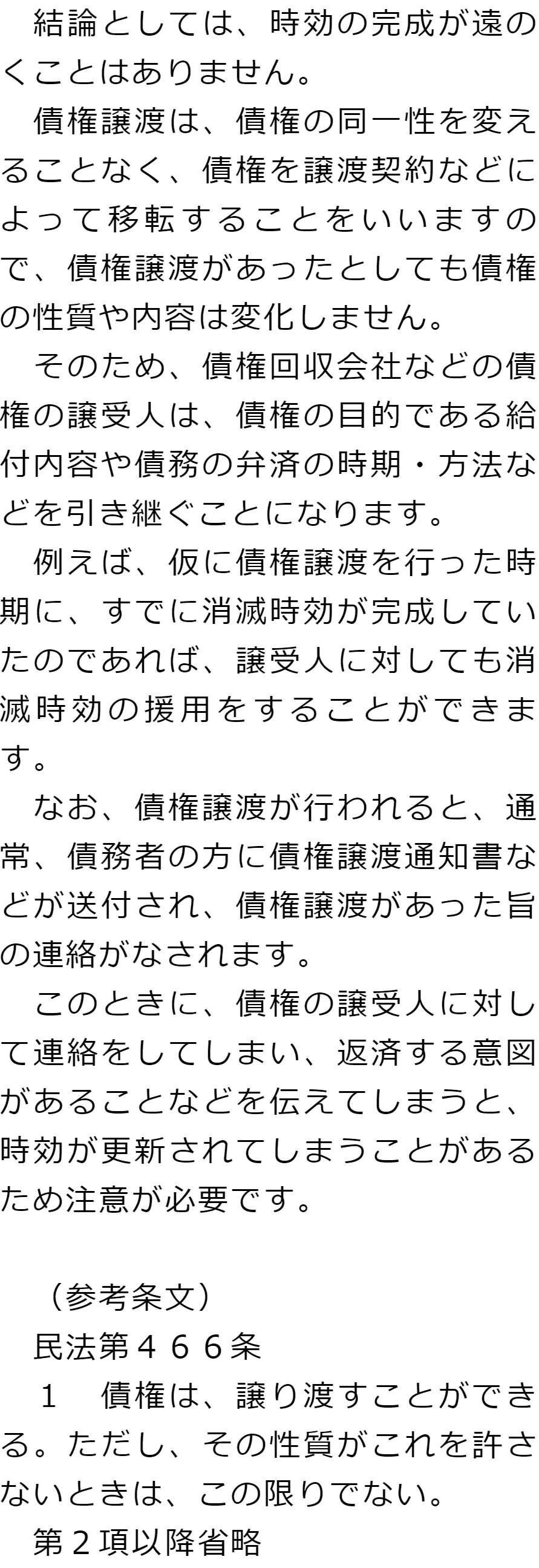 債権譲渡と時効に関するQ&AQ債権譲渡が行われていた場合、時効の完成は遠のくのでしょうか?Qどこに債権譲渡が行われたか分からないのですが、時効の援用を相談できますか?Q債権回収会社から連絡がきたのですが、どうしたらよいでしょうか? Q債権譲渡が行われていた場合、時効の完成は遠のくのでしょうか?A Qどこに債権譲渡が行われたか分からないのですが、時効の援用を相談できますか?AQ債権回収会社から連絡がきたのですが、どうしたらよいでしょうか?A お役立ち情報・Q&A(目次)お役立ち情報・Q&Aトップお役立ち情報どのようなことをすると時効の利益の放棄になるかQ&A債権譲渡と時効に関するQ&A 受付時間 平日 9時~21時、土日祝 9時~18時 夜間・土日祝の相談も対応します (要予約) 所在地 〒111-1111 ●町●●建物● 0120-41-2403 お問合せ・アクセス・地図
