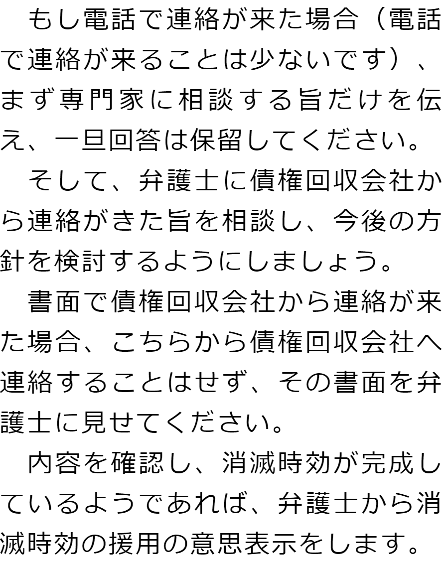 Q債権譲渡が行われていた場合、時効の完成は遠のくのでしょうか?A Qどこに債権譲渡が行われたか分からないのですが、時効の援用を相談できますか?AQ債権回収会社から連絡がきたのですが、どうしたらよいでしょうか?A お役立ち情報・Q&A(目次)お役立ち情報・Q&Aトップお役立ち情報どのようなことをすると時効の利益の放棄になるかQ&A債権譲渡と時効に関するQ&A 受付時間 平日 9時~21時、土日祝 9時~18時 夜間・土日祝の相談も対応します (要予約) 所在地 〒111-1111 ●町●●建物● 0120-41-2403 お問合せ・アクセス・地図